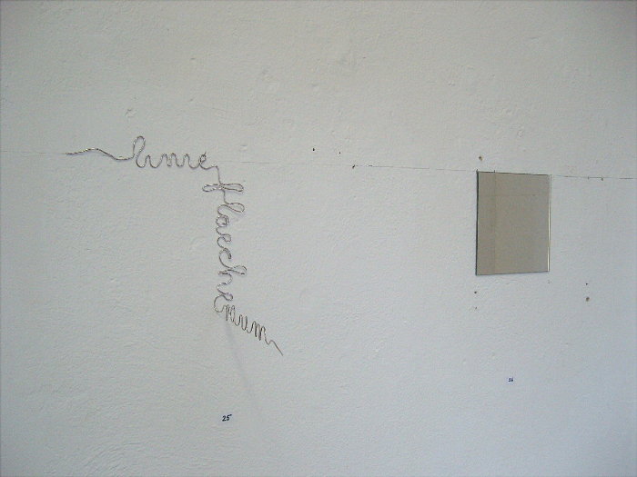 "linieflaecheraum", 2008, Aludraht, 25 x 25 x 25 cm "x³ auf 0,04 m²", 2008, Spiegelglas, 20 x 20 cm "Den Ausstellungstitel fast wörtlich setzt der Bildhauer Lothar Rumold mit seiner kleinteiligen Wandarbeit "linieflaecheraum" in Szene: Aus Aluminiumdraht ist der titelgebende Schriftzug nachgeformt und beschreibt als gefaltete Linie andeutungsweise einen sich in den Raum arbeitenden volumetrischen Körper. Daneben führt eine zweite Arbeit desselben Künstlers das Spiel von der Öffnung der Fläche in den Raum fort: In "x m³ auf 0,04 m²" eröffnet sich mit Hilfe eines quadratischen Spiegels ein unendlicher Blick in den gespiegelten Ausstellungsraum und in weiterführende Raumreflexionen der rückwärtig liegenden Fensterscheiben." (B. Reich in den Badischen Neuesten Nachrichten, 4.2.2009) zurück zu Chronik |