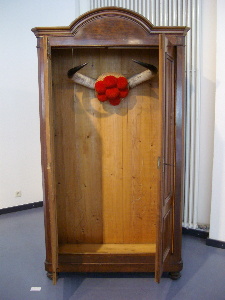 Schrank mit weggetextetem Wandobjekt von Dorothea Panhuyzen: "Schwarzwaldmädel", 2007 Wo Bildwerk war, kann Schriftstück werden. Das kollektive "verdrängte Unbewusste" der Bilder und Objekte von Helmut Binninger, Monika Fulda, Gabriele Goerke, Christoph von Haussen und Rolf Linnemann, Tim Stefan Heger, Ingolf Jännsch, Dorothea Panhuyzen, Marja Scholten-Reniers, Gisela Späth und Valentin Vitanov kommt zu Wort in Gestalt einer Erzählung des Schweizer Autors Jürg Amann: "Hardenberg - Romantische Erzählung nach dem Nachlaß des Novalis", zuerst erschienen 1978, aufgeteilt in zehn Abschnitte mit jeweils ca. 1.250 Wörtern. Ein Programmheft hält fest, welche Bilder oder Objekte in welcher Reihenfolge durch welche Textpassagen ersetzt wurden. Die Segmentierung des vollständig wiedergegebenen Originaltextes und die blockartige Präsentation ist Teil der Inszenierung und entspricht nicht dem ursprünglichen Erscheinungsbild der Erzählung. Das verdrängte Unbewusste des Bildes kommt im Text zur Sprache. Das verdrängte Unbewusste des Textes taucht auf in anderen Texten. Wenn die Beziehung zwischen den "weggetexteten" Werken und Jürg Amanns Erzählung weitgehend dunkel und rätselhaft bleibt, heißt das nur, dass wir mit unseren Weg-Erklärungen und Übersetzungen, mit unseren Kritiken und analytischen Explikationen vorläufig noch an kein Ende gekommen sind. Lothar Rumold zurück zu Chronik |
