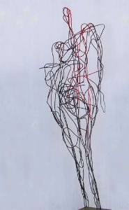 Stefanie Welk: "Miranda", 2007 Lothar Rumold: "In Bildern denken". Einführungsrede zur Eröffnung einer Ausstellung mit Drahtplastiken von Stefanie Welk im Klinikum Langensteinbach am 16. Mai 2007 Liebe Stefanie Welk, Herr Professor Diehm, meine Damen und Herren, als ich vorgestern am frühen Abend nach einem vergewissernden Blick auf die hier versammelten Exponate wieder nach Hause fuhr, klang aus dem Autoradio folgende Botschaft an mein Ohr - gestatten Sie, dass ich das jetzt nicht singe: "Eins und eins, das macht zwei,/ Drum küss und denk nicht dabei,/ Denn denken schadet der Illusion./ Alles dreht sich, dreht sich im Kreis/ Und kommst du mal aus dem Gleis,/ War's eben Erfahrung anstatt Offenbarung,/ Was macht das schon?" Da beinahe alle Sender mittlerweile die Coverversion dem Original vorziehen, war es leider nicht Hildegard Knef selbst, die mir da im Walzertakt vom Denken abriet, weil es der Illusion schaden könnte. Wenn Denken am Lack der Lebenslügen kratzt, beschädigt es dann auch die Formen und Inhalte der Kunst als jener großen Bühne der imaginierten Wirklichkeiten, der aufwendig inszenierten Täuschungen und unermüdlich gemalten Wunschbilder? Dass Kunst und Illusion oder, um es schärfer zu formulieren: Kunst und Lüge sehr viel mehr miteinander zu tun haben könnten als uns lieb sein mag, darauf weist auch ein Satz von Friedrich Nietzsche hin: "Wir haben die Kunst," sagt Nietzsche, "damit wir an der Wahrheit nicht zugrunde gehen." Die rettende Lüge der Kunst bewahrt uns, so übersetzte ich das, vor dem Sturz in den Abgrund letzter Illusionslosigkeit. Dass Stefanie Welk ins inhaltliche Zentrum ihrer Kunst das sich ständig neu, wenn auch jedes Mal anders über sich selbst täuschende Individuum stellt, macht den Fall in ihrem Fall, um den es heute ja geht, noch ein wenig komplizierter. "Der sich immer wieder neu entwerfende Mensch ist mein zentrales Thema", notiert die Künstlerin 2006. Die Mechanismen der Selbsttäuschung und Selbstenttäuschung reflektiert in einem Medium, das wir nach Nietzsche haben, damit uns die Wahrheit nicht ereilt. Meine Damen und Herren, ich glaube Sie sehen es mir nach, wenn ich die Entwirrung dieses Gedankenknäuels heute noch nicht in Angriff nehme. Was mache ich hier eigentlich? Ich greife einen Gedanken auf, füge einen zweiten hinzu, verknote ihn mit dem ersten, ein dritter Strang schafft eine vage Querverbindung und allmählich entsteht ein Gebilde, in dem gedankliche Linien von irgendwoher kommend in die verschiedensten Richtungen weisen, gleichwohl aber der Eindruck, um nicht zu sagen: die Illusion eines gestalteten Ganzen sich herausbildet. Um es in den Worten Stefanie Welks zu sagen: "Gebündelte Linien bilden Sphären, energetische Verwirbelungen deuten Bewegung an." Natürlich bezieht sich ihre Beschreibung nicht auf meine sprachlichen, sondern auf ihre eigenen, bildnerischen Figuren. Man könnte den Beginn von Stefanie Welks künstlerischer Laufbahn datieren auf das Jahr 1987. Die Fünfzehnjährige erhielt damals eine Medaille in einem europäischen Plakatwettbewerb. Zahlreiche weitere Auszeichnungen folgten dieser ersten. Dennoch schlug Stefanie Welk nach dem Abitur in ihrem Geburtsort Heidelberg nicht den Weg in die nächst gelegene Kunstakademie ein, sondern absolvierte von 1992 bis 1999 ein Psychologiestudium, das sie als Diplompsychologin abschloss. Parallel dazu begann ihre gestalterische Auseinandersetzung mit dem Werkstoff Draht. Zukünftigen Kunsthistorikern wird es vorbehalten sein, sich damit zu befassen, wo genau und wie im einzelnen sich die Psychologie im Frühwerk der Künstlerin niedergeschlagen hat. "Gebündelte Linien bilden Sphären, energetische Verwirbelungen deuten Bewegung an." Ich greife in meine Materialkiste und knüpfe an dieses weiter oben in den Rederaum ragende Drahtstück mit einem Bündel weiterer Gedankenstränge an. Stefanie Welk stellt uns den menschlichen Körper, denn ihm gilt ihr hauptsächliches Interesse, nicht als fest umrissenen Gegenstand vor, sondern sie inszeniert ihn als dynamisches Ereignis. Mir gegenüber sprach die Künstlerin von ihrer Liebe zum Körper, die sie auch zum Tanz und zur Massage geführt habe. Zu beobachten ist eine deutliche Vagheit bei der Bestimmung der räumlichen Grenze jener Ereignisse, die wir Körper zu nennen uns angewöhnt haben. Ereignisse haben einen zeitlichen Aspekt, von dem wir, wenn wir von Gegenständen sprechen, in der Regel absehen. Bei einer Reihe von Arbeiten hat Stefanie Welk zeitliche Abläufe gestalterisch transformiert ohne sie als solche abzubilden, also auf die Leinwand oder den Bildschirm zu bringen. In Sezierübungen ganz neuer und ganz eigener Art, legt die Künstlerin anatomische Strukturen frei, die nur noch entfernt an die Körperwelten eines Leonardo da Vinci oder Gunther von Hagens erinnern. "Noospheric bird" ("Noosphärenvogel") heißt eine Arbeit aus dem Jahr 2004, die hier zu sehen ist. Der Medientheoretiker Marshall McLuhan bezeichnet die Noosphäre als die "kosmische Membran, die sich durch die elektrische Erweiterung unserer verschiedenen Sinne rund um den Globus gelegt hat" und damit "ein technisches Gehirn für die Welt" bildet. Der Begriff der "elektrischen Erweiterung" kommt mir in Bezug auf Stefanie Welks Schöpfungen plausibel vor - ob Vogel oder nicht, Noosphärenbewohner scheinen sie irgendwie alle zu sein. Wir finden in ihnen nicht allein den Gegensatz zwischen Mann und Frau oder Mensch und Tier im Bilde aufgehoben, sondern auch den zwischen Nervenbahn und Kabelstrang, zwischen organisch oder technisch oder einfach nur ätherisch vermittelten Energieflüssen. Die Grenzen des Körpers werden ebenso erweitert und damit unbestimmt und unbestimmbar wie die der Geschlechter und der Gattungen. Der physikalische Raum, in dem stofflich manifeste Körper lokalisiert werden können, geht über in eine geistige Sphäre - gemäß einer älteren Definition handelt es sich bei der Noosphäre im Gegensatz zur Biosphäre um den Bere