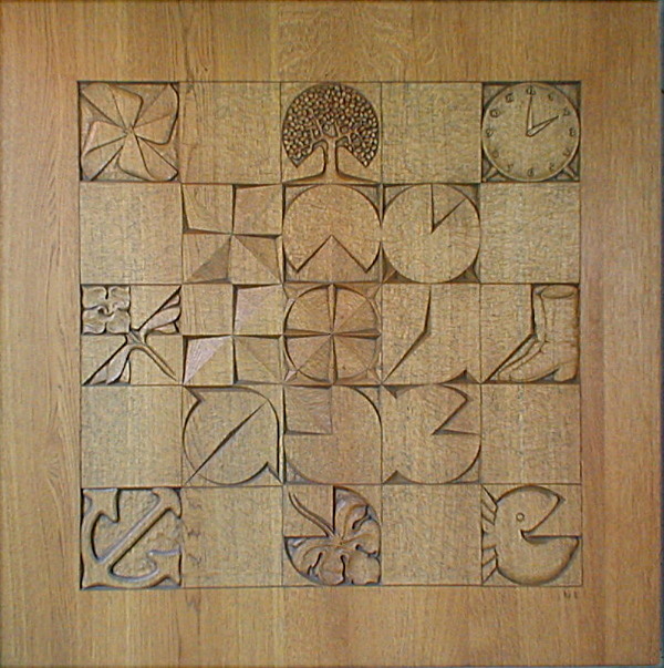 ![]() "Blume und Blatt ankern im Wind, Wecker und Baum aber stiefeln fischwärts", Meisterprüfungsarbeit 1994, Eiche, 105 x 105 x 5 cm Aus dem rasterartigen Konstruktionsmuster im Zentrum des Bildfeldes kann man durch achtmaliges Abdecken bestimmter Linien die Schemata des mittleren Formenreigens gewinnen, deren konkrete Bild-Pendants im äußeren Quadrat zu sehen sind. In gewisser Weise enthält das Zentralsymbol alle konkreten Ausformungen wie Baum, Stiefel und Fisch. In umgekehrter Lesrichtung kommt man vom Konkreten über das Abstrakte zum Universellen. Das Protozeichen in der ruhenden Mitte, um die herum sich alles abspielt, ist weniger Form als Potential, weniger Zeichen als Zeichenvorrat. Da es auf alles Mögliche und auf nichts Bestimmtes verweist, zudem zwischen allem und allem vermittelt, ist es weniger dem Bereich der Symbole als dem der Medien zuzuordnen. Angeregt wurde diese Arbeit von Adrian Frutiger: Der Mensch und seine Zeichen. Schriften, Symbole, Signete, Signale. 1989 (zuerst 1978). zurück zu Chronik |